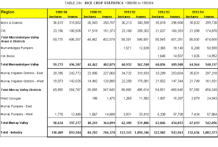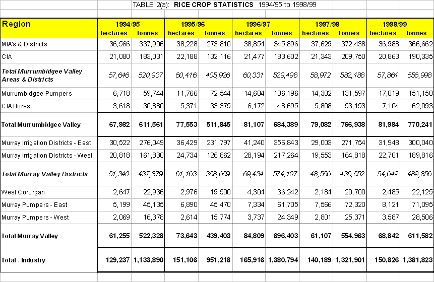 In the other regions there may still be potential for further growth by attracting new participants - i.e. water used for other purposes being allocated to rice. However, given the restraints on irrigation activities that have developed or are developing, as discussed later in this paper it is difficult to envisage total rice sowings exceeding the peak of 166,000 ha that occurred in 1996/97.