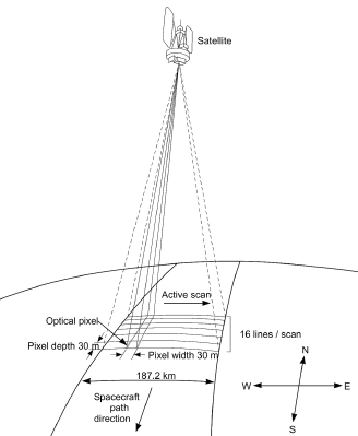 Remotely sensed images are recorded digitally by sensors on board the satellites. An example of a satellite operation is shown in Figure 1. The satellites vary in height above the Earth's surface from approximately 700 km, which orbit the earth, to some 36 000 km, which are geostationary above the equator. The images can be manipulated by computers to highlight features of soils, vegetation and clouds. Each pixel, or picture element, contributing to the image is a measurement of a particular wavelength of electromagnetic radiation at a particular spatial scale for a particular location at a specific time. The most common display of remotely sensed data is a single overpass, which non-remote sensing specialists may think of as a `satellite photo'.