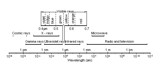 Figure 2. Breakup of electromagnetic spectrum. Note that the scale is logarithmic. [Adapted from (Harrison and Jupp, 1989). Reproduced by permission of CSIRO Australia].