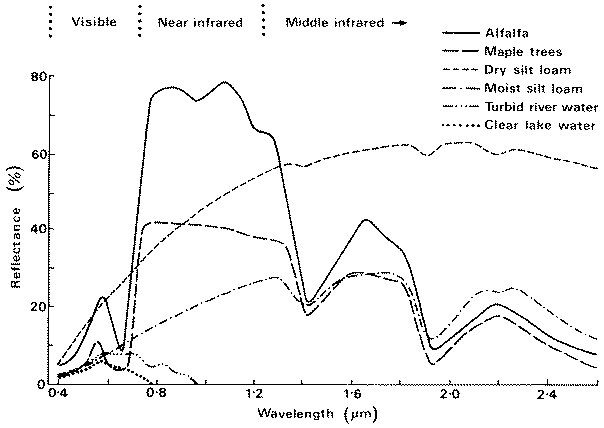 The advantages of using time series of several data sets, including those not observed remotely, is illustrated in the following example from Barrs and Prathapar (1994) and Barrs and Prathapar (1996). An irrigation company may want to estimate crop area in order to plan for the marketing of specific crops. To get an early estimate of rice production, a November image was acquired, in which standing water was used to estimate rice area. Standing water can be easily identified in the NIR portion of the EMS where it has a low reflectance (see Figure 3). In order to map other crop types and to delineate standing water areas on which rice was not grown, a March image well into the rice growing season was then acquired. This image was used to refine the end of season yield prediction by `fine-tuning' the irrigated area estimation from the first image. By determining areas that were still standing water, they could ascertain that these were either failed crops or permanent water bodies. The later image was also used to classify other summer crop types, with varying confidence. Other GIS data, like field delineations and known water bodies, could also have been used to adjust the classification. Errors of omission as well as errors of commission can be corrected, increasing classification accuracy. For example, in a land use map, if 90% of a known field is classified as rice, it makes sense to assume the whole field is rice, thus fixing some errors of omission. However, in a land cover map, knowing, for example, that 10% of the paddock planted with rice did not grow successfully can be valuable information for estimating yields, thus fixing some possible errors of commission. The difference between land use and land cover should be noted as these should not be combined in thematic classes.
