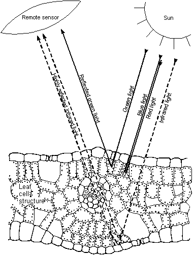 Figure 4. Schematic reflectance of a typical green leaf in cross section; chloroplasts reflect the green light and absorb red and blue light for photosynthesis. Near infrared light is highly scattered by water in the spongy mesophyll cells.