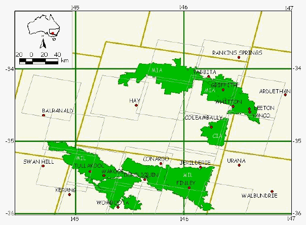 The cost estimates for specified common commercially available remotely sensed data is summarised in Table 3 by each irrigation area in southern NSW. These estimates are intended to give potential users of remotely sensed data a general idea of the costs involved, and by no means are meant as a precise cost. Values in this table are most useful when viewed in the relative context of prices by sensor and by irrigation area. Figure 5 provides the spatial context of the extent of two popular sensors ((E)TM and SPOT) for the study site.